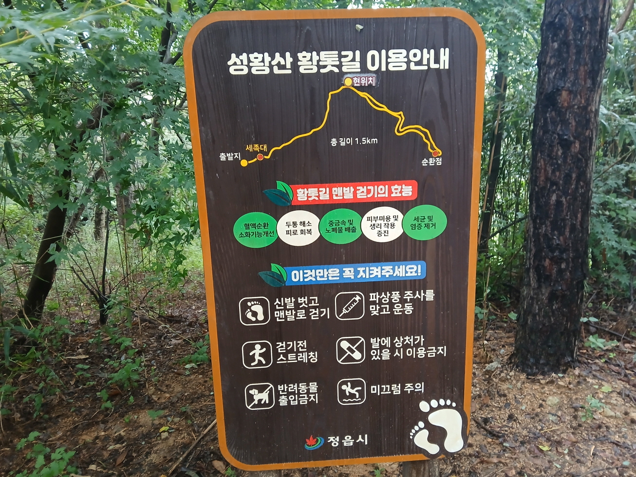 8. 탐방코스: 국립농산물품질관리원→현하우징→검은비닐하우스→산죽군락지→두락봉→성도사/ 충무공원 주차장 사거리 갈림길→시청/ 부영1차아파트 사거리 갈림길→정읍초교/ 성황산 갈림길→성황산 왕복→들어지봉/ 월명산 삼거리 갈림길→들어지봉 왕복→월명산/ 정읍제2산업단지 삼거리 갈림길→월명산 왕복→북면육교→호남고속도로밑 터널 통과→남양홍씨묘→시루봉→고속도로밑 터널통과→(주)부창푸드→별빛정원→호남선 철로밑 터널 통과→국립농산물품질관리원