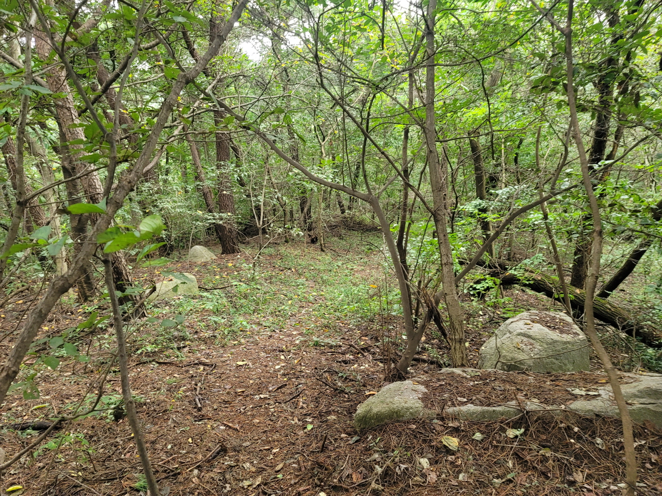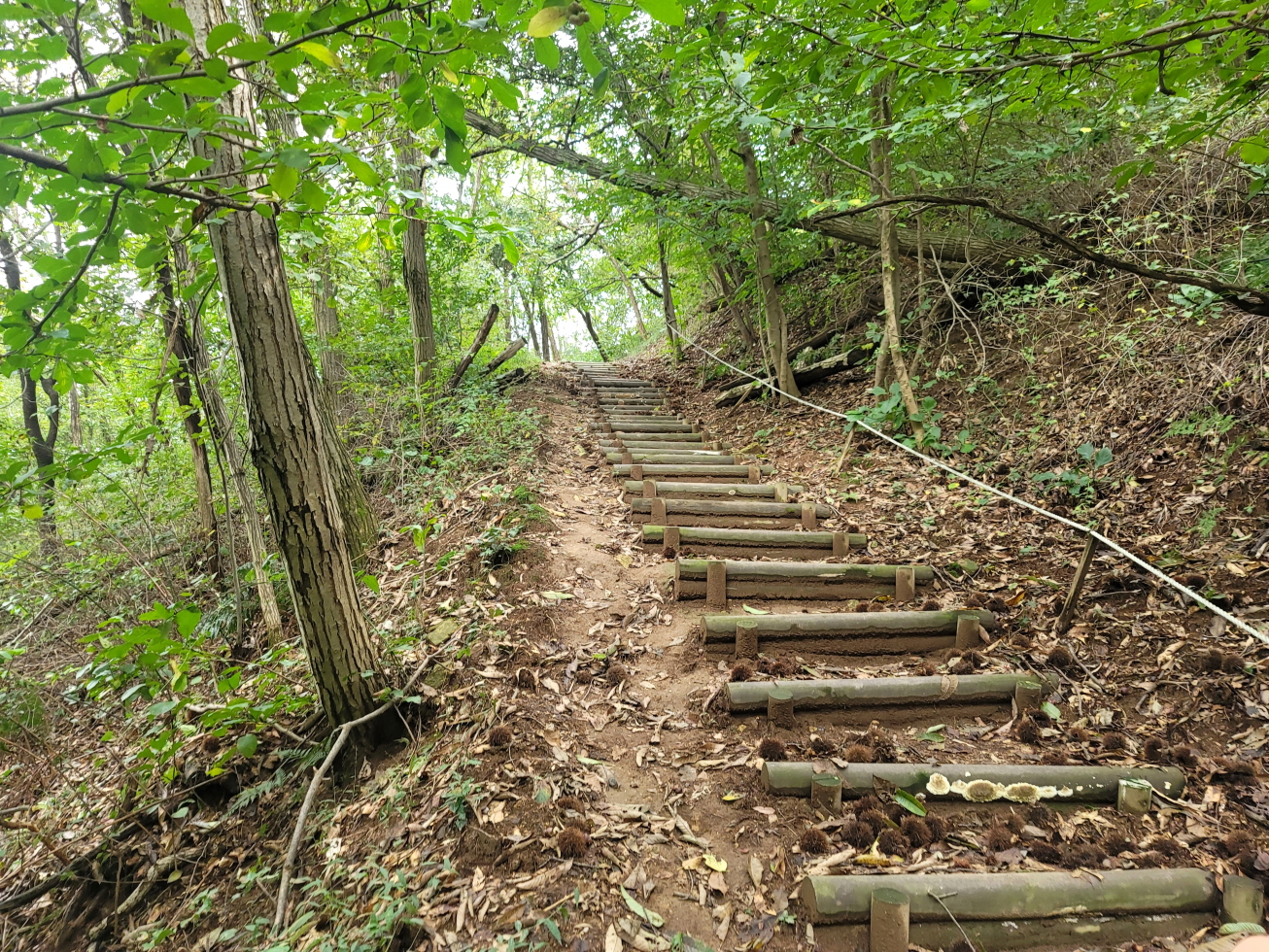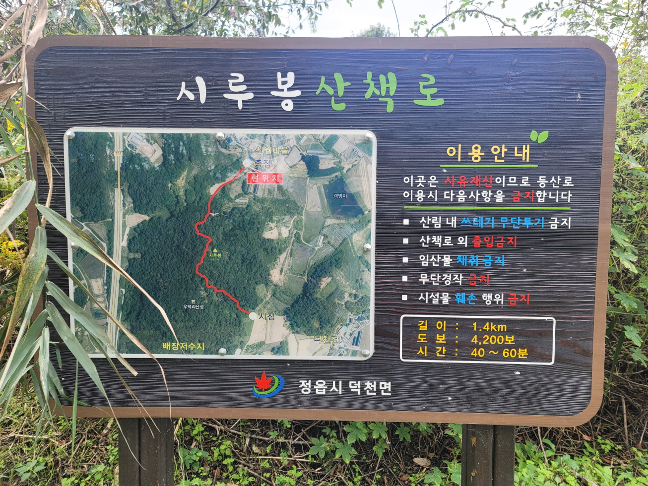 내 지도에 표시되어 있었고, 현지에도 산책로 안내판과 마을회관앞 비석에 시루봉으로 표시되어 있었다. 시루봉 오름길은 우덕리 산성으로 오르는 정비된 길로 좋은 길이었고, 우덕리 산성을 지나면 길이 점점 희미해져 약간의 잡목을 피해 용전사거리로 하산하였다.