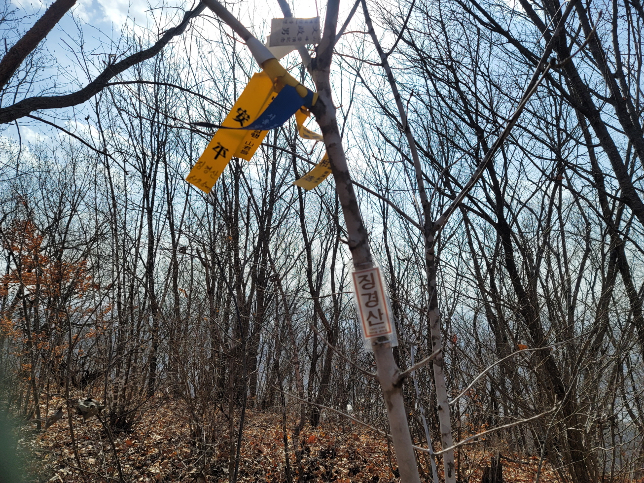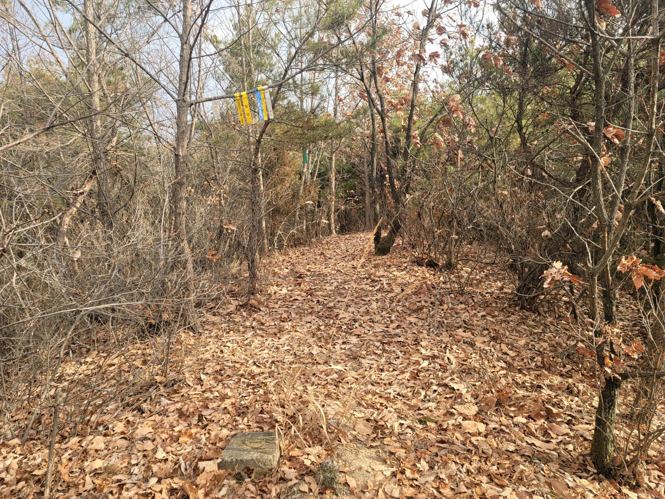 오늘은 경북 영천의 미답지인 자라등→말머리산→징경산→봉암산 탐방하기로 하며 금대리(새터) 마을앞 공터에 주차를 해놓고 산행을 시작하였다. 이번 주 처음 계획은 전남 광주로 계획하였으나, 많은 눈과 비 예보로 인하여 산행지를 바꾸었다. 이곳도 토요일은 노고산과 위지지를 탐방하기로 하였으나, 일기예보에 맑다고 해서 현지에 도착하였으나, 많은 비가 내려 또다시 산행지를 이곳으로 옮겼다. 오늘 탐방하는 산행지의 산과 봉명 모두가 내 지도(구/ 오룩스)나 다음 지도엔 무명봉이었다. 그러나 어느 지도에 표시되어 있는지는 모르겠으나, 정상에 많은 선답자분들의 표시기가 걸려 있는 것으로 보아, 분명 어느 지도인가 표시되어 있지 않나 추측해 본다. 등산로 상태는 안내도나 특이 사항은 없었지만, 대부분 완만하고 선명하였다. 중간 말머리 산 가는 길에 낡은 이정목이 두 개 세워져 있었으나, 정상 표시는 없었다.