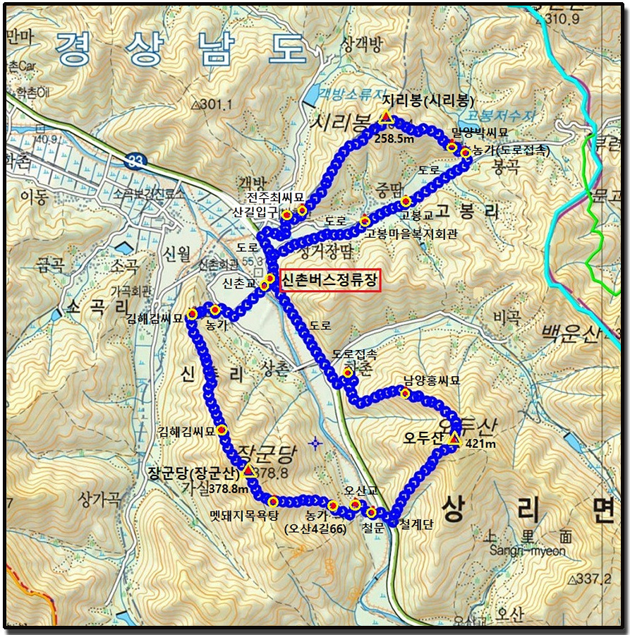 8. 산행코스: 신촌 버스정류장→신촌교→무량사 삼거리→임도→김해김씨 묘→김해김씨 묘→장군당 정상→멧돼지 목욕탕→농가→오산교→도로건너→철문→철계단→오두산 정상 →남양홍씨 묘→도로→신촌 버스정류장→고봉마을→산길입구→전주최씨 묘→지리봉정상→밀양박씨 묘→농가(도로접속)→고봉마을 복지회관→신촌버스 정류장