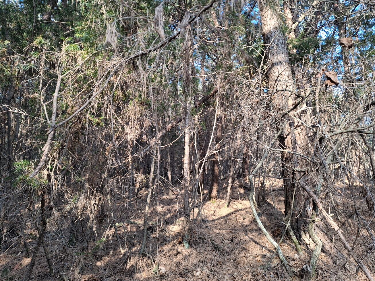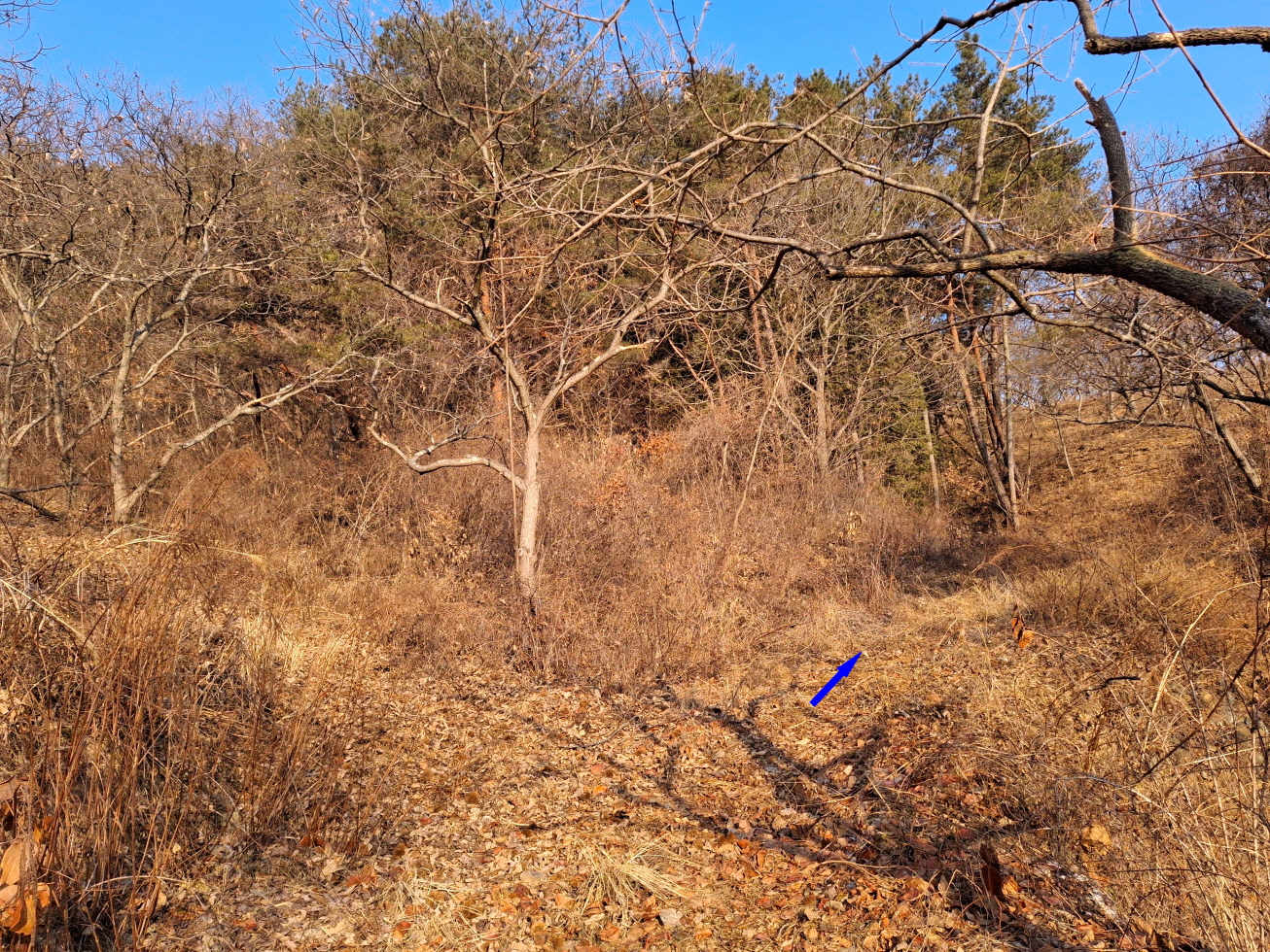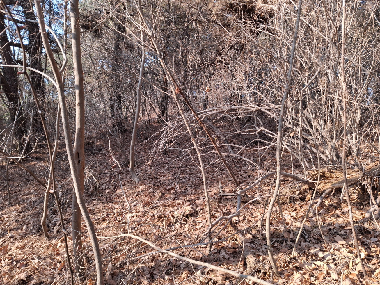 내 지도에 표시되어 있으며, 등산로 상태는 초입부터 정상을 지나 파란 물탱크까지는 길이 없고 가시잡목 구간이었으며, 파란 물탱크를 지나서부터는 묵은 임도로 되어 있었다.