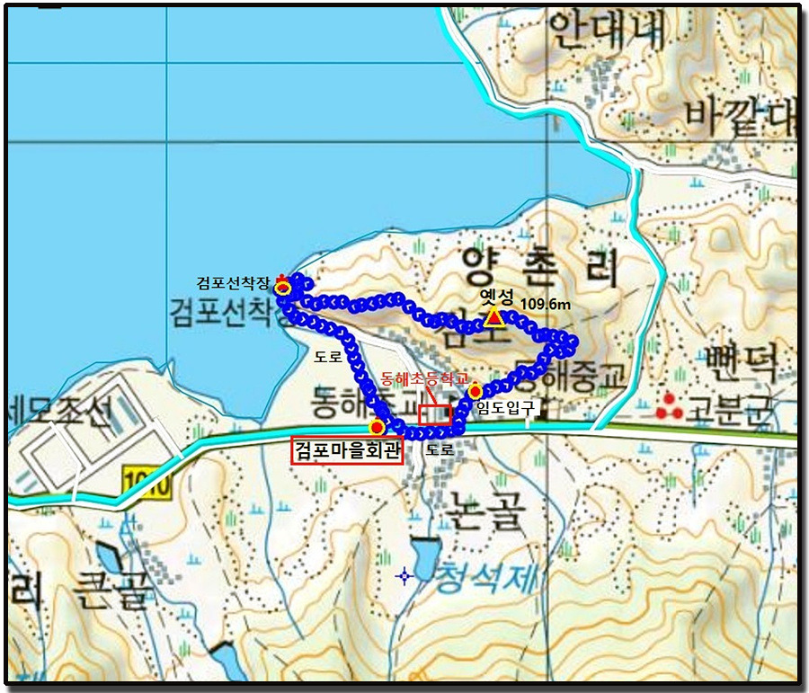 8. 산행코스: 검포 마을회관→도로→동해초교 옆길→임도입구→임도→옛성 정상→하산로→검포 선착장→도로→검포 마을회관