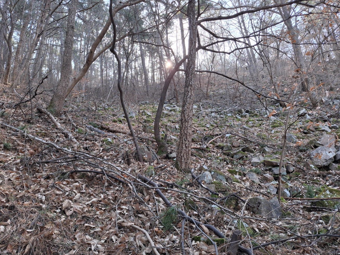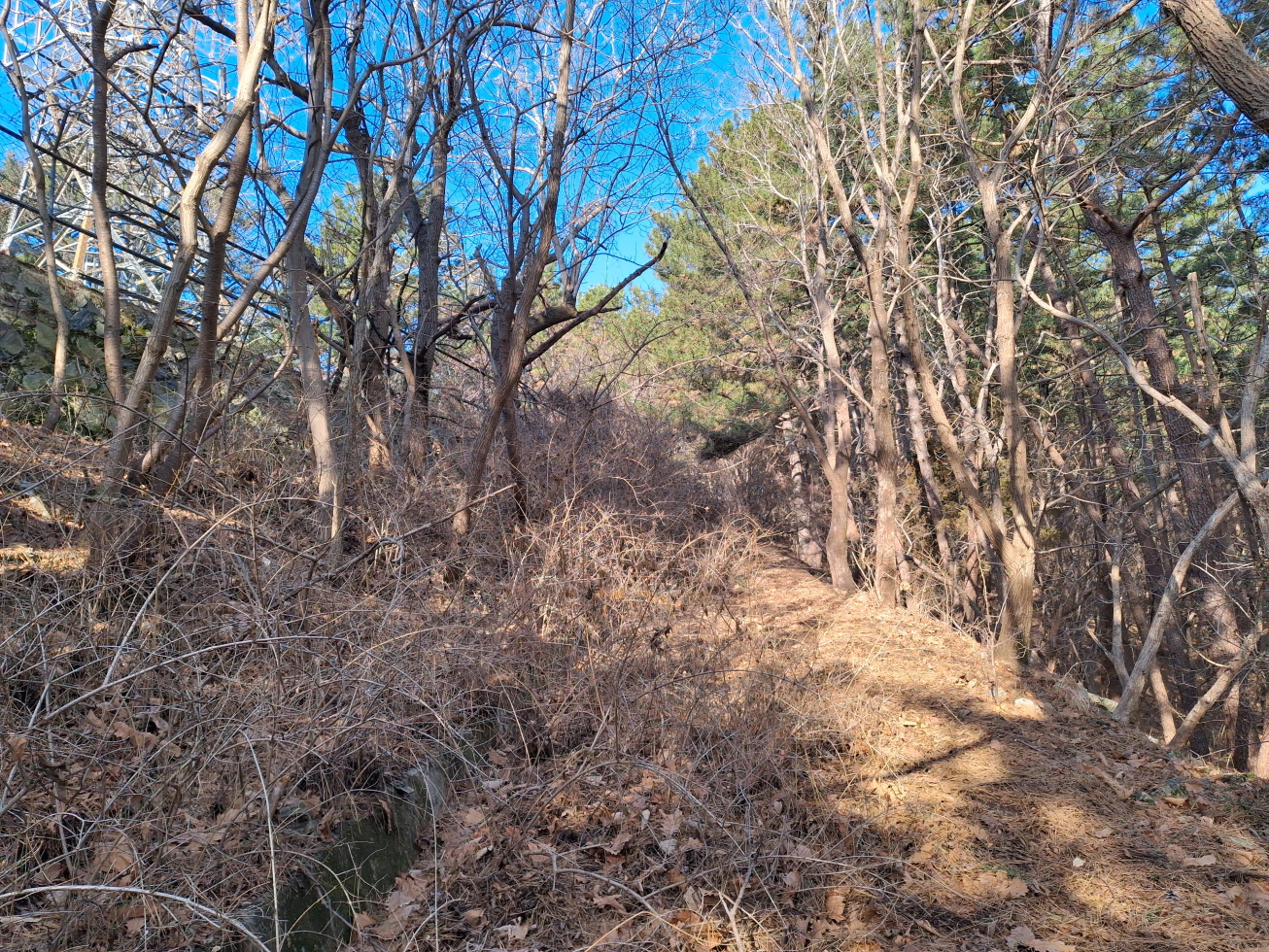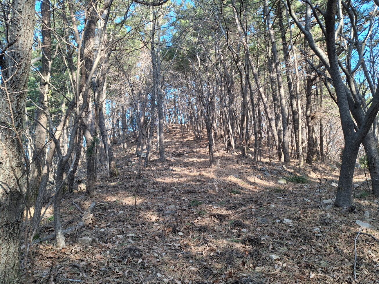 내 지도에는 무명봉, 다음 지도에는 천황산이라 표시되어 있었다. 별다른 특징은 없었지만, 산 아래 정토사 간판에 천황산이라 표시되어 있었다. 오름 길은 오래 전에는 있었던 것으로 보였으나, 현재는 흐리고 급 오름 길이었다.