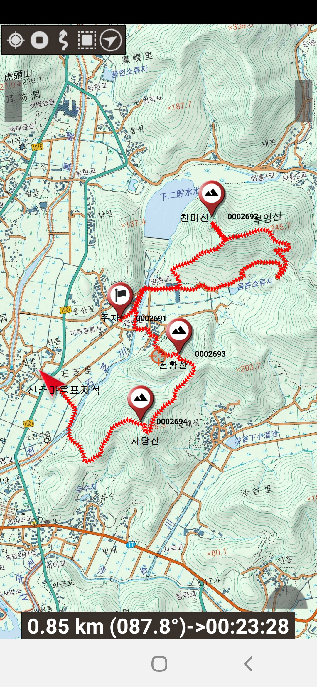 8. 탐방코스: 석지리(음촌마을)앞 공터→양촌교→축사→임도→철탑→부엉산→양촌마을/ 천마산 이정판→천마산 왕복→험한 바위길→경주최씨묘→축사→양촌교→음촌마을 뒤→산길 진입→천황산→철탑→두번째 철탑→사당산→전망대→정자→신촌마을표지석